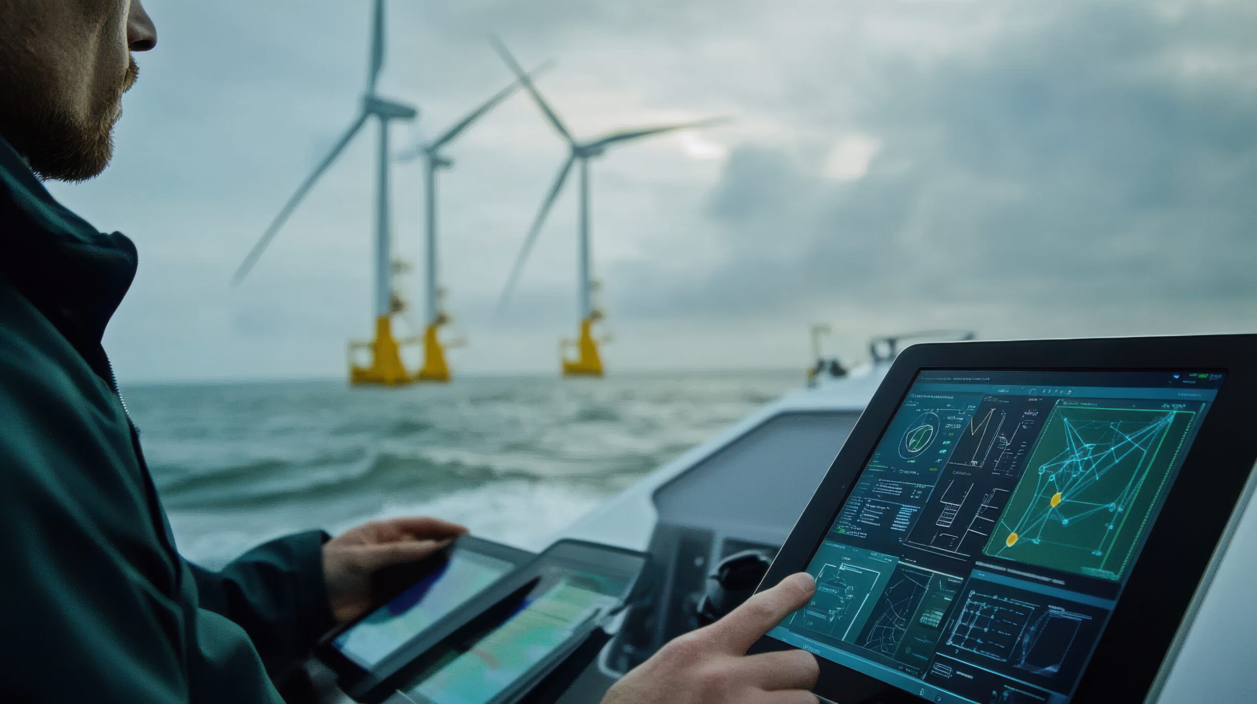 An operator uses advanced control systems to monitor wind turbines in the sea. The image captures the blend of technology and renewable energy in a marine environment.